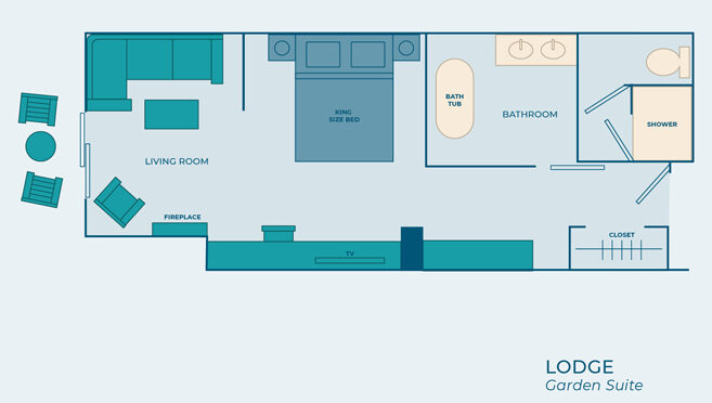 This 550-square-foot suite blends modern comfort with cozy charm, featuring a semi-private king bedroom, spacious living area with sectional sleeper sofa and fireplace, and a large bathroom with soaking tub and rain shower. Step outside to your private garden or patio for fresh mountain air and a moment of calm. Sleeps up to three and offers access to the adults-only level of the Lodge