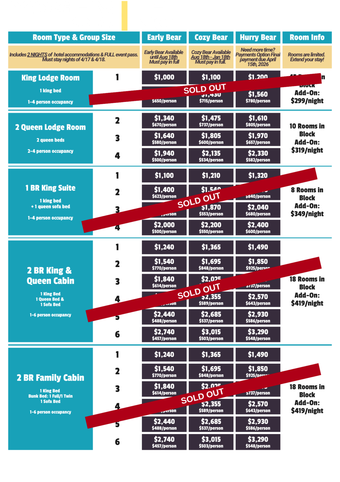 - Add up to 5 additional Passes to a 2 Bedroom Cabin:
