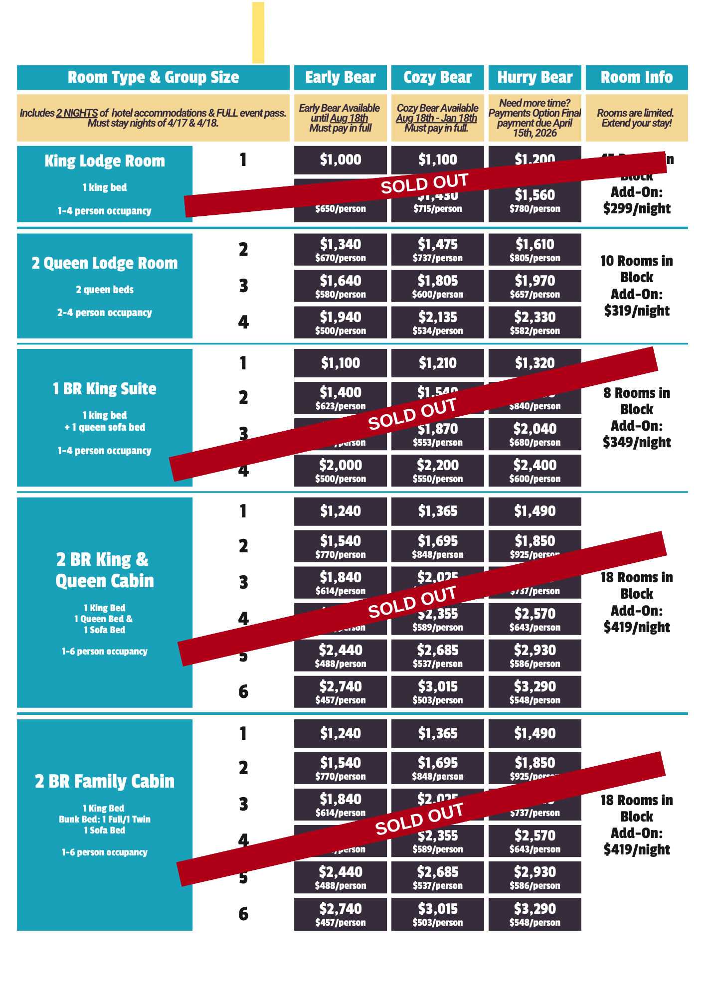 - Add up to 3 Tickets to a King Lodge Suite Room: